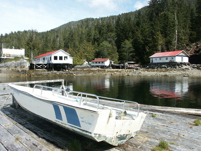 They walked up the gang plank and down to the other side past the fuel dock to see what the conditions were on the other end. They radioed back that they thought we could tie up there with their help. So we cautiously maneuvered in and thanks to everyone’s help, we tied up. We tied up to broken planks and anything that we thought would be secure. The docks were in hideous condition and not a soul was around from Duncaby Landing to guide or help us. The captain on “Raven” fell through the planks and almost hurt himself seriously. The wood was so rotten it gave no support. Thank goodness there was a log below the planks that prevented him from falling all the way through into the freezing waters. We’re also grateful he didn’t get hurt because we were in the middle of no where land for medical attention. Duncaby, despite its ratty docks, was very picturesque as we entered the channel. Their crisp white buildings with bright red roofs were a welcome site from a distance. They made a nice back drop against the forested hillside nestled amongst several small islands. The landing is totally protected from whatever may be out there in the main channel. The docks were in such a shamble that it was unbelievable actually. We’re wondering if this is what we have to look forward to up the road. Some of the docks were only connected by a few floating logs tied with ropes. We literally had to find a plank to lay over between the docks to enable us to cross to the fuel dock to get up the ramp to the main buildings. Huge rusty nails were protruding ou tof every pathway. Lumber debris, old chains, plastic bins and old broken crab and shrimp traps where littered everywhere. We walked up the gangway ramp to the boardwalk that leads to the buildings. Not a soul was to be seen except a black dog that greeted us. Doors to the tool sheds and other buildings with “valuable” items were wide open for anyone to enter and take what they wanted. The place was deserted but in such a way that it looked like it was evacuated in a hurry. It was in a way, kind of scary. We hollered to see if someone was there but no one answered except for the black dog. This place was nothing like we expected since the boating guides said it was open year round. The book said it was a fun place to be and the restaurant and store were hopping. It was supposed to have new docks from Fury (another place a few miles north) and power, etc. We checked the whole place out and let Ziggy do his thing. Ziggy must be feeling much relieved after that long trip. He and the black dog seemed to tolerate each other very well. The boating guide also said Duncaby Landing boasted accommodations of 8 rooms. The rooms were in a shack plopped up on some rocks. You had to cross a rickety plank to get to them. There was one bath at the end of the hall for all to use. The accommodations were pitiful, almost hobo like. Guess the sports fishermen come here to fish and are so drunk they don’t care. Comforts must not be a priority. It must be the “real wilderness experience”. Plumbing and pipes were hanging out the bottom of the shack just dumping whatever on the shore. The restaurant and store were closed. It looked like the owner’s house was in the back behind a gate. We didn’t go back there. We went back to our boats and had lunch. Bill and Joy were on “Patience” and Susan and Reiner on “Raven”. They dropped by our boat to see the inside and chatted for a bit. We were invited back to “Patience” at 5:00 for cocktails. I crashed on the chaise lounge on the upper deck in the warm sunshine and Larry crashed below. Ziggy was in charge of the dock. At least at this place he could run lose and what would it matter? There was no one to bother and nothing to destroy. There was a big loud Raven that was teasing him. So, he was busy chasing him off “his dock” and barking at the splashes the water made against the dock. He was in his glory free to do his own thing. Later in the afternoon I went inside and slept more on the bed. We were exhausted as we got up at 4:45 AM. We went over to “Patience” at 5:00 to see what these people were all about. I took some smoked salmon and triscuits. Susan brought cashews and Joy on “Patience” had made fresh bread with butter and three different cheeses which everyone just devoured. We were there for hours! We talked about their experiences and places to go and what to expect. Guess we’re going to go with them tomorrow to see Fury Cove and then end up to Codville Lagoon for our next stop. We all made a plan to leave at 8:00 AM. (From what I could make out Joy is a photographer and graduated from Brookes Institute. She said she is writing a book on their travels to Alaska. Bill seems to know it all but is very nice (he was in the airline business). Reiner was a programmer for IBM. Susan and Reiner built a house in Friday harbor and custom built their boat. It was in Passagemaker magazine in one of their latest issues. It was brand new.) We got tours of both boats. We’re three good looking boats docked here at this crummy place. Both of these women learned to dock their boats from Brian Calvert in Friday Harbor. I was very impressed with them. DATE: Wednesday, May 22, 2002 We got up at 8:15 AM. The seas in Rivers Inlet have a light chop. Duncaby Landing is a good place to get inspired to write a murder mystery I think. It’s so eerie with all the open doors and no one around. Just when you think you are alone, you see someone sneeking around out of a door and going behind a building (shack really) or getting into a little ratty boat and leaving without a word. It’s just men and strange looking men. They look like loners and are dirty and unshaven. We learned everyone was suffering from a huge hangover yesterday, (I guess that’s why they were so quiet and looked so bad.) so much so, that they weren’t able to come out to greet us all day. Ken, the owner, managed to come down to our bo