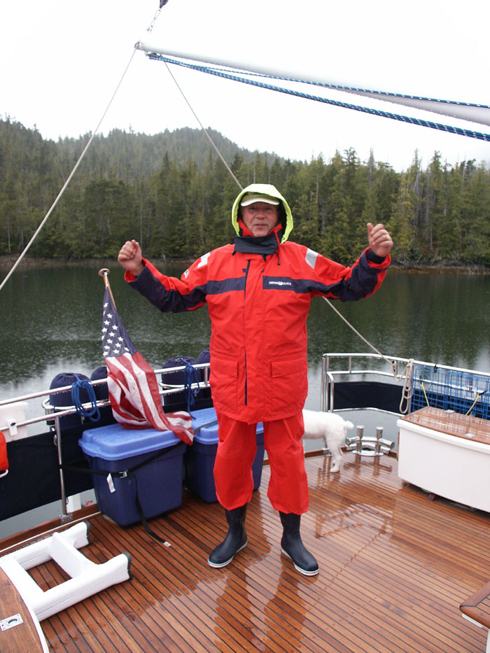 We’re listening to the weather report again and trying to familiarize ourselves with the whole new set of names and all the while not being able to hear or make out the report because of bad reception in our cove: Green Island, Triple Island, Vanilla Island, Langen Island?, No. Boss, Mc Innes Island, Bonilla Island, Dryad Point, Asbrooke Island, Egg Island, Cape Scott, Pine Island, Scarlett Point, Automated: Grey Island, Lucy Island, Prince Rupert, Holland Rock, Bener?, Rose Spit, Herbert Island, Sartine Island, Green Island, Triple Island, Vanilla Island Ocean Buoy: North Nomad, Middle Nomad, South Hecate Straight, West Morresby, South Moresby (West Coast Charlottes) Douglass Channel was reported to have 5-15 knot winds, light to moderate, variable. 20-30 knots this evening with 2’ seas rising to strong to gale force winds. Again you can see all the areas you must be familiar with, their locations and implications to your destined route.
