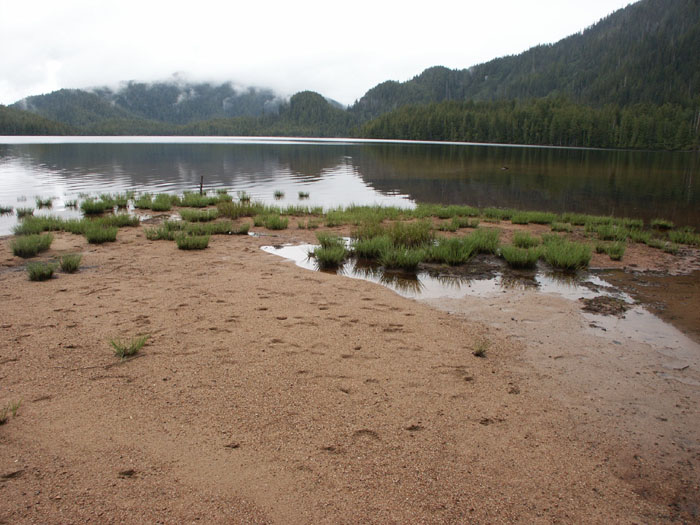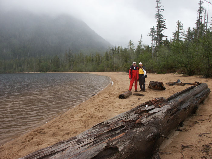 saying something like the trail to the lake is maintained by users. We tied the dingy up and let out a lot of line for the tide to take her out. We checked the tide tables first and figured we were going at high tide as it was just turning so we would have enough time to get back without worrying about the dinghy getting stuck high and dry. The dingy is heavy and I don’t think I have enough energy to help Larry drag it very far so we wanted to make sure we didn’t get stuck on shore since no one was around to help us. Once ashore, we changed from our rubber boots into our hiking boots and left the rubber boots stuffed in our bag on shore near the dinghy. The trail was a pretty good trail (better than the one I remember at Chatterbox Falls that we climbed last year). The trail takes you to Sagar Lake. It’s a bit muddy in places. People have brought planks in and laid logs down to help make a path. At one point there was a rope handrail to help you up a 20 foot vertical granite rock. It took us about 35 minutes each way, though the cruising book says 20 minutes. You are rewarded at the end of the trail with a 3 mile wide lake with a beautiful orange sand beach back dropped by a high mountain. You can hear the roar of a waterfall across the lake. There are two granite avalanche chutes on the mountain that are actually visible from our anchorage. The place is forested with cedar and silver shoots. We sat on a log and contemplated the place eating our snacks and taking some pictures. Ziggy went crazy running up and down the beach in the sand. He was happy as could be. He loves to wander and investigate in the woods. He enjoyed the hike running and sniffing along the trail. We were a little apprehensive about him running so free since we passed several bear crossings over the trail. You could see their huge prints in the mud path. Zig stays pretty close and comes when you call him so we decided to let him enjoy himself. It was a great feeling to be at the lake and not another soul around. Not a human foot print or trace of another human being to be seen. The lake was flat as glass and reflected the surroundings. It was a beautiful place. We came back to the boat and Larry rigged up my new fishing rod. I took the newly rigged rod and headed out in the dinghy to catch dinner with the promise that Larry would clean it. It was great on the dinghy since it had been modified with a steering wheel and comfortable seat. Ziggy went with me and we explored the different lagoons and tried fishing in different spots. Before long I had tangled the line and had to come back for Larry to fix it. We had to take it back for Larry to fix. Zig and I went out for another try and noticed near the entrance to our lagoon a seal laying on some rocks that were now exposed with the low tide at the North entry. That was his spot, like his thrown. He was like a mascot to the lagoon. From that perch he watched everything. At times, he had a couple mates. There was nothing that got by his attention. Zig and I didn’t catch a thing but I discovered how relaxing and quiet fishing is. I think it’s a keeper. Doesn’t really matter if you catch anything does it? Larry had washed some windows and put Rainex and Fogex on them. We’re hoping this will keep the windows from fogging up in the damp raining weather and will give us better visibility. I was very cold from being out on the dinghy and Larry turned the generator on to warm the boat up. Late that afternoon, two Grand Banks came in. One was “Dauntless” (Raven’s last boat) and the other was “Grand Impulse”, Tom Enright’s friend. They anchored together and rafted up by putting out a stern anchor. Looked like they knew exactly what they were doing or had a lot of practice. We decided to go to Shearwater tomorrow. We took Zig out and let him get off the boat on his own to do his thing and he came right back to the boat and jumped on when he finished. Good dog. Larry dropped me off and went over to say “hello” to the two boats. When Larry came back, he said Tom Enright’s friend was “occupied” so wasn’t able to say hello.