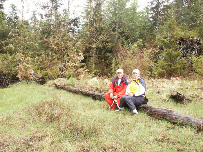 We were up at 7:42 AM. I thought I heard thunder in the distance, or our anchor moving, or one of the other two boats raising their anchor to leave. It must be our anchor moving because the tide is coming into the lagoon and no one seems to be up yet. The currents are strange and strong in this part of the country. It’s cloudy, not raining, but very wet out. Looks like this is par for the course and we’ll have to learn to get used to this. We have had 70% rain for the trip so far. We got our gear on and took Ziggy to shore and checked out the trail to the lake. We swung by “Patience” and “Raven” to say hello. They were getting ready to leave for Ocean Falls. We hadn’t decided yet whether we were leaving for Ocean Falls or Shearwater. Their plans are to catch up on their laundry in Shearwater. They left together as they came. We tried listening to the weather report but the reception was bad. We could only get pieces and those were rustic. We had put out crab traps yesterday along with “Patience” and no one caught anything. They use pellets for bait and we used chicken. Larry pulled up a sunfish in the trap but let it go. It looks like a starfish but is soft and jelly like with many arms. It was a bright orange. Larry wanted to stay in Codville another day so we decided to go hike the trail to the lake.