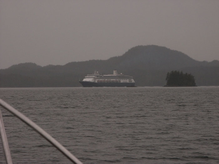 We munched on some granola and milk for breakfast and had a scone later for a snack. Last night Larry ate so many appetizers that he couldn’t eat dinner so I zip locked the steaks we were going to grill and we’ll eat them today. We still have great satellite TV but the phone service is out. “Patience” has a satellite phone and could get very slow email. He has four phone numbers. One for Friday Harbor people and I forgot what people the others were for. I think I’d get mixed up trying to keep them straight and who gets what number. He has two radars; one for long range and one close. 11:00 AM: We can see the “Queen” ferry about two miles behind us on our port quarter. When we docked yesterday we all had to have a toast to “Poseidon”. Bill and Judy made it a tradition to thank Poseidon for a safe trip by having a small toast. They say they do that every time they take the boat out and come back safely (even to the fuel dock). (I wonder if they are planning on doing that when we arrive at our anchorage at Codville Lagoon.) I don’t think Larry’s going to go for having to get his dinghy down for that. The “Queen of the North” is going to pass a mile on our port. 11:20 AM: We hear two large ships, the “Queen” and another, confirming which side they will pass each other on. In the distance we see another huge ship on the other side of the channel masked by the fog heading down towards the Queen as she rapidly goes by. We’re waiting for her monolithic wake as” Patience” has warned us all about. We see ahead another mass of sea gulls flying erratically and diving in the midst of many dolphins that are swiftly swimming and diving across the water. 11:25 AM: We’re passing Hakai Passage and feeling the choppiness from the Queen Charlotte Sound. The Queen looks like a baby passing the huge black bottom cruise ship that appears. It’s the “Ryndam” Holland American Cruise Line. It seems that the big vessels keep to the West side of the Channel. 12:20 AM: We