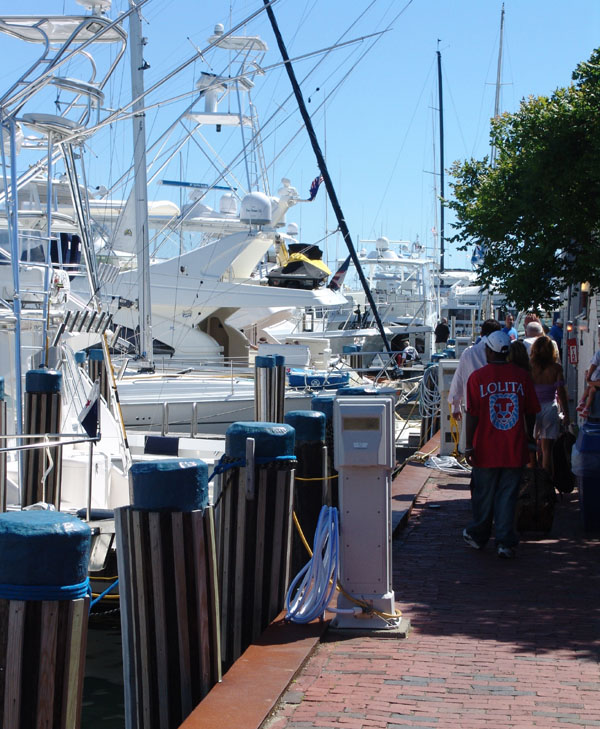 NANTUCKET BOAT BASIN We had a good slip location, far enough from all of the town noise and parades of people walking by. We had good visibility though to see what was going on in the basin, watching boats come and go and the boaters around us at the docks were a friendly nice group of people. We also were not docked directly in front of the bathrooms or a laundry room which was a good thing as some boats were. We were thinking this was pretty perfect until the girl from the dock office came around to give us our “official” welcome packet which really should have been called the “rules packet”. I was inside the boat when she arrived and didn’t hear the welcome spiel, but the look on Larry’s face when he came in pretty much told the story. He had a bunch of papers in one hand, (the rules) and a long flimsy clear plastic trash bag in the other. Here’s the jist of it: We were required: (1) NOT to discharge sewage in the harbor (which is a no brainer as we would never even think of doing that.) (2) NOT to discharge any grey water in the harbor. (3) NOT to run your dishwasher. (4) NOT to run your washer. (5) You are REQUIRED to recycle but in this manner: a. Household waste should go in one clear plastic bag, the kind which is sold at the dock office (which means nothing goes down the garbage disposal), I guess. b. Aluminum, tin cans, and plastic containers MUST be separated and stored in the clear plastic bags, sold at the dock office, and deposited in specific trash bins. c. Glass bottles and light bulbs MUST be separated and stored in the clear plastic bags sold at the dock office, and deposited in specific trash bins. d. Paper, magazines and newspapers MUST be tied in bundles, put in the clear plastic bags sold at the dock office and deposited in specific trash bins. e. Cardboard MUST be broken down and flatten in nothing bigger than 3’ x 3’ squares. (6) You are urged to use all dock facilities for showering. (7) You are urged to use all dock facilities for toilets. (8) You are urged to use only the products on their list for washing the boat and other necessary uses on the boat.