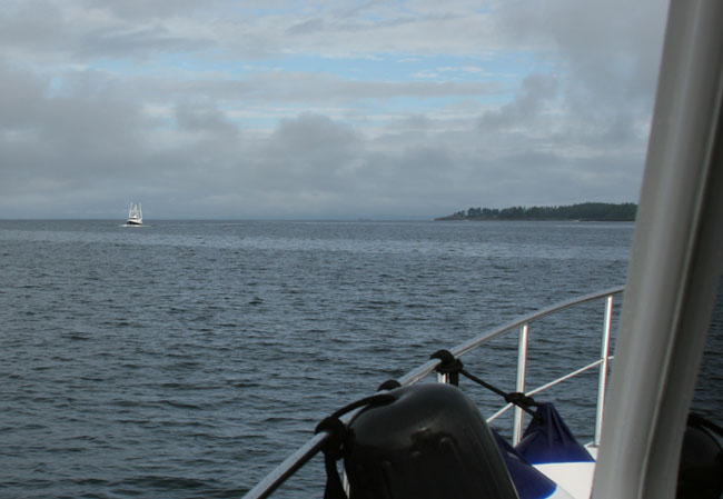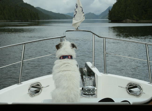 M/V PATIENCE HAILS US To our surprise and shock we hear an old familiar voice on the radio. It’s one of the boats that we cruised with during out Alaska 2002 trip. It was M/V Patience hailing us. We say “hello” and in the distance coming out of Reid Passage we can see it’s them. We watch them coming towards us heading the same way we came out, but they’re heading down Seaforth Channel to Shearwater. They’ve been cruising Alaska and are heading home. They said it was a short trip this year as they had some engagements they needed to get home for. We passed and waved to each other and Ziggy barked a big “hello” though I’m sure he hasn’t a clue who or what we were waving at. It was so great seeing them again and hearing their voices. We were so sad we missed them at Shearwater and didn’t have the opportunity to catch up and visit. Larry takes advantage on the short radio conversation to pick Bill’s brain for some anchorages. They are seasoned cruisers up here and know all the best places and all the ins and out and the trouble spots to stay away from. We said we’d hope to see them in Friday Harbor at the tail end of our journey and wished each other safe journeys home.