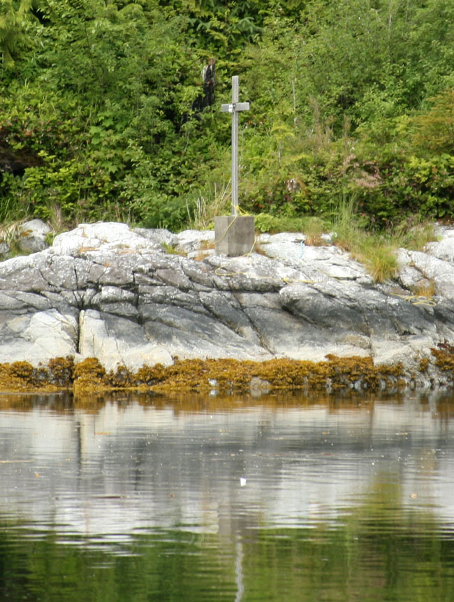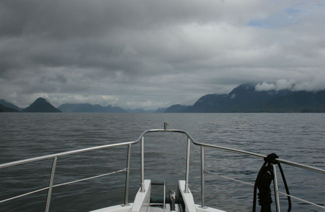 MILBANKE SOUND As we head out into Milbank Sound we begin to feel the swells. They are large but far apart and not steep. It’s a bit scary to me being out here in the swells but I soon get used to it once I see the boat again handles them so well. The swells are about 6 foot tall with a period of 10 seconds which is a very smooth ride. OK, now I know what that feels like. Even though we’ve been through much rougher seas on our trip south through the canal and up the East Coast, I’m always nervous about new places thinking there is going to be some kind of weird thing we haven’t experienced. We are certainly experienced in these kinds of seas but I’m still a little nervous about these northern waters. At least we can see land and are heading towards a channel far in the distance that we will be back into the protection of the land. Reid Passage is a beautiful passage and on a clearer day it would have been a passage I’d regret not seeing again but today the magnificent tall hill tops are sadly decapitated by these grey depressing clouds. We pass a stick sticking up which is the top of a big dead head buried under the water. That is scary. That’s what you have to watch out for around here. Ziggy is a little nervous and has a worried look on his face and Larry picks him up to comfort him. Our chart plotter suddenly lost our route. Larry had to turn every off and reboot. Soon we have our course back again. Mmmm modern technology. We hear on the radio boat traffic channel that a boat that will be at Mc Ginnes Point at 10:20 AM. Her name is Radiant to the Seas. There’s also a cruise ship coming up behind us in about an hour. We can hear Prince Rupert Traffic telling him: “if you are more than one five minutes off your float plan you are to let us know.”“ He answers back: “Roger”. We’re off Cross Point now. The swells are still here but they are smooth and there isn’t a wind ripple across the smooth swelly waters. We’ve got 8 knots on our nose. All is well. I look out ahead and it looks calm and flat. There is a speck on the silvery horizon line of the ocean. It’s a red marker identifying some dangerous rocks.