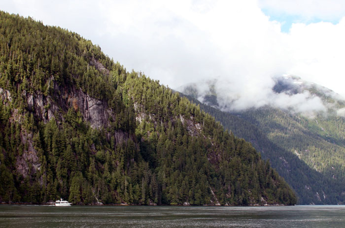 Well, we have our last glance at Finlayson Channel and now head up into Tolmie Channel. It hugs nicely along side Princess Royal Island on our left and over the top of us another sea plane or maybe the same one flies over us and up the channel in the opposite direction from the last one, following it like we do, flying low and turning up the channel as it does. We hear a call hailing us. It’s from Mary One. They just came out of Jackson Pass and wondered how our trip around Ivory Light and Milbank Sound was. We told them it wasn’t bad at all, that the swell were 6 foot but far apart so it was a nice cruise. They said their transit went well also. As we pass Cougar Bay and we hit the current and it drops our momentum down about two knots.