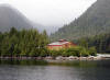 We are passing a widening in Tolmie Channel by Swanson Bay. It’s another possible anchorage if Khutze is full though it looks very open to the channel. We see a tall brick chimney projecting over the tops of the forest. It and some crumbling posts left from their dock are all that remain of the old sawmill that was very important way back when there only were hand loggers in this area. This are was popular for the sole logger before the days of chain saw a A-frames as they only used axes and the steep sides of the mountains made it easier for a single logger to slide the cut trees right down into the water. The sawmill bought all their logs and cut them and readied them for towing As we are nearing the marker at Khutze Inlet. The channel up ahead is looking fogged over. The winds have picked up to 20 knots and they are rushing down the channel hitting us straight on our nose and the current is going with it, so we have two strong foes against us now. We have about 22 minutes until we reach Larry’s final waypoint just inside Khutze Cove and then we’ll be out of it. We will then edge our way around the green spit where we hopefully can find enough room to anchor and lay out the chain with enough swing room. Our other option is to go further into the cove, another 45 minutes, and try to anchor right in front of the waterfall on a small mud ledge that drops off very quickly into depths that are way beyond anchoring depth. Hope the first option works. I’m thinking if neither works we’ll have to come back out and head up the channel in the fog and go to Hartley Bay, another Indian village. Or, we could go to Bishop Hot Springs, another two hours. Maybe we could go to Butedale but everyone says it’s falling down so bad that we might not be able to find anyplace suitable at the dock. Let’s hope the first option works.