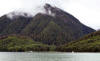 The weather seems to be opening up a little and we start to see a bit of a green tone to all this monotonous grey whiteness. The clouds are breaking up now and becoming a mixture of white and dark and very puffy. They look like balls of cotton. The shores are rocky and black. The white foamy waves contrast against them sharply as they pounding away at them, creating brilliant splashes, each one more spectacular than the next. They crash, and then disperse into huge fans of spray that shoot up into the air with such beauty and power. They hit the rocks with such power and then fling back their newly created arms spread wide as they ride up into the air, out and down, over and over again. Instead of the usual mountain images of steep forested side that come straight down to the ocean clifflike, here the mountains level out before they reach the water’s edge. They look like big giant slides. It is such beautiful scenery.