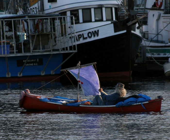The only thing stirring around here are the ferry boats coming and going and the harbor patrol just went out. The artist that paints in his skiff by the fish and chips joint slowly motors by, towing his artist’s studio, the skiff. He must be heading to the little fry joint to get set up for the day. I wonder if he sleeps in that boat and where the heck did he come from? Speaking of characters, yesterday, late afternoon, another local character that seems to live in an old beat up kayak (yes, a kayak) “sailed” by in his modified kayak with a make shift sail. I guess he wanted to join in the fun with the Vancouver Sailing Club that was showing off their talents and colorful sails yesterday.