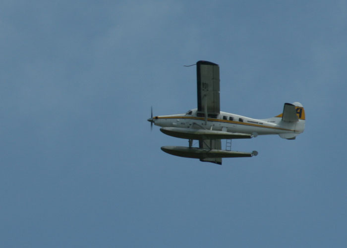 DECIDE TO HIT THE WATER Well, suddenly cruisers are leaving. So we decide to hit the road, or water I should say. I head out the channel as Larry takes in the fenders and lines as I hurt my thumb from the weight and strain of handling those big lines and heavy fenders. We’re not alone as we head out the harbor as three commuter float planes come out beside us and take off just feet away. As we head out the channel I see the sky over the Straight. It’s dark and filled with heavy clouds. I’m thinking there’s a forecast for rain later today but maybe it’s speeding up its schedule. The BC Ferry crosses over in front of me heading to Gabriela Island. He’s far enough away not to affect my path. I feel the volume of his wakes though they have diminished considerably to soft swells as he slowed down quite a bit on his approach.