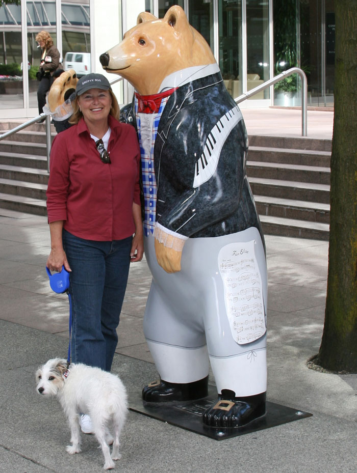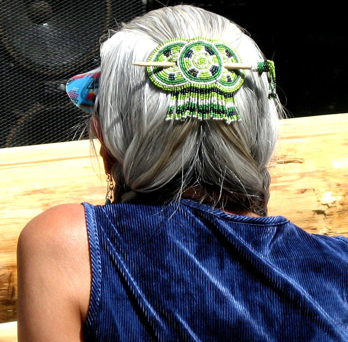 It’s a great museum, now housed so beautifully in the renovated Old Court House. The front steps no longer serve as the main entrance but serve as a make shift Spanish Steps as we witnessed on the spectacularly nice weather day, people had plopped themselves down on the steps to have lunch or rest or just watch the world go by. We had lunch just up the block at the Bacchus Restaurant in the elegant Wedgwood Hotel. It’s very clubby but has a friendly atmosphere as the windows of the lounge and bar open to the street. It was beautiful weather so it was a perfect place to be. Another great place to eat in that area is the Art Museum Café (if the weather is nice). It’s outside on the upper level, shaded by bright umbrellas and over flowing planters filled with flowers and light classical music fills the air. You can’t help but feel very uplifted. After lunch we walked around to the park area in the back of the museum to see the Aboriginal People’s festival. The famous Old Vancouver Hotel, now the Fairmont, which grandly still holds it’s own in this city of new sky scrapers, was the backdrop of the festival and the silhouetted teepees were grand against this old matron. We sat for awhile on the split log benches that they had set up for the festival and listened to some Haifa’s sing and dance and speak about their culture. They were dressed in their full native regalia, capes made of red and black fabric decorated with white buttons, not the historical decorations usually displayed with endangered abalone shells, or puffin beaks, or dental regalia as in the past. This is the modern day version I guess. We were so lucky to be able to see the exhibit and get a taste and introduction for what our summer destination will be.