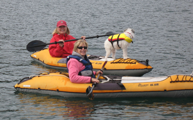 Island. PERFECT SPOT It was a beautiful afternoon and the perfect scenic spot to be anchored. 4th of July, though fun, is always a problem with little animals who are terrified by the booms and cracking noises of fireworks. This year has especially been bad as people have been setting them off almost nightly for two weeks prior to the official date. Ziggy is on the verge of a nervous breakdown. We were hoping to escape the chaos of the celebrations over in Roche by coming here. We've never seen Roche Harbor so packed! Here in our little anchorage we had a lovely view of a farm at the entry of the harbor and good views out to the main channel with occasional glimpses of those amazingly huge monolithic freighters and other cruisers going by. Bart and Sharon had the same idea as they too were trying to spare their two little pups the same grief. We all snuggled into to this peaceful place away from the rat race outside. We had a few other boats to keep us company in the anchorage maybe with the same idea. The anchorage certainly wasn't crowded, which was nice. Couldn't ask for more. TRY SOME KAYAKING We brought our inflatable kayaks with ua as I was hoping to show Sharon how to kayak. I couldn't believe she actually up for trying one out because she's not a swimmer but those type of things don't seem to stop this girl, in fact she knows everything about that big engine inside their Selene, and does the changing of the oil, cleaning of the sea strainers and a slew of other things that I don't have the foggiest understanding of. She can carry on a engine room conversation with Larry like no buddy's business. That's just a few of the many things that she can do. I'm in awe actually. FIRST TIME Well, we soon got settled, with our little Protector tied next to Sea Casa, pumped up the kayaks and plopped them in the calm slack water. I gave Sharon a quick demo on how to ungracefully get in the kayak doing my very best to be graceful. Zig as usual hopped on the "hood" and we paddled out a short distance to give assistance if needed while Larry and Bart helped Sharon get in. She slid right in like a pro and slowly off we went. She did just great right off the bat and had the hang of the paddles and all the maneuvers pretty quick. Soon she was manuevering the kayak in slow but steady turns, stops, and even backward motions. I expressed how amazed I was that she was so willing to do this as she doesn't know how to swim but she said she had her life jacket on and felt confident. Well, she CAUGHT ON RIGHT AWAY After a few swings around the boats and anchorage I asked if she wanted to try it with Ziggy as a hood ornament for awhile. "Sure" she said without hesitation. I paddled slowly over and told Zig to jump aboard and Sharon kept the kayak steady while he did. Again, she got the hang of it immediately. We did another couple loops around the anchorage and then back to Sea Casa to show off but the guys were deep in a Dominos game and hardly gave a glance up over the rail. Once they did have a peek Bart did have enough time to say the pups, Jackie and Bailey, were going crazy wanting to join in the fun with Ziggy (or maybe they were distracting from the game as Larry was ahead at this point). So, soon the pups, all two of them, were aboard her kayak! It was amazing and so cute to watch. Well, the photos below tell the story better than I.... .......the pictures tell the story...