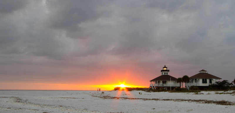 We took one last ride on our rented golf cart to the end of the island again. We had just one intent and that was to get a picture of the lighthouse. This would be our last chance as you could see the mass of storm clouds rapidly heading our way. The one speed, and I might say slow speed, of the golf cart was struggling hard to get us there before dark. Fortunately we made it just in time to see the sun going down over the Gulf as the ominous dark storm clouds rolled in and just as the light tenders turned the watch light on. Perfect timing as two lovers headed past the light into the sunset.