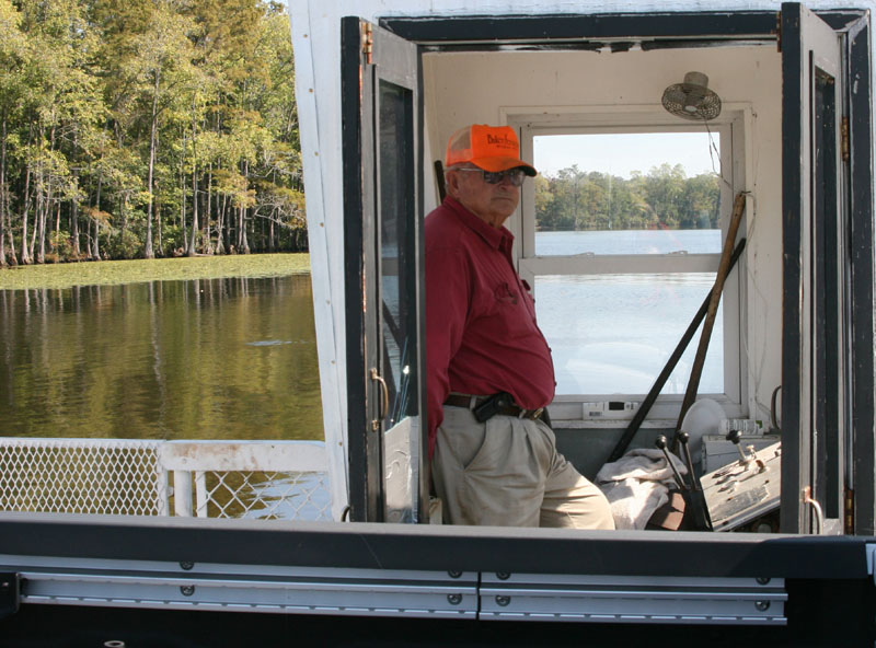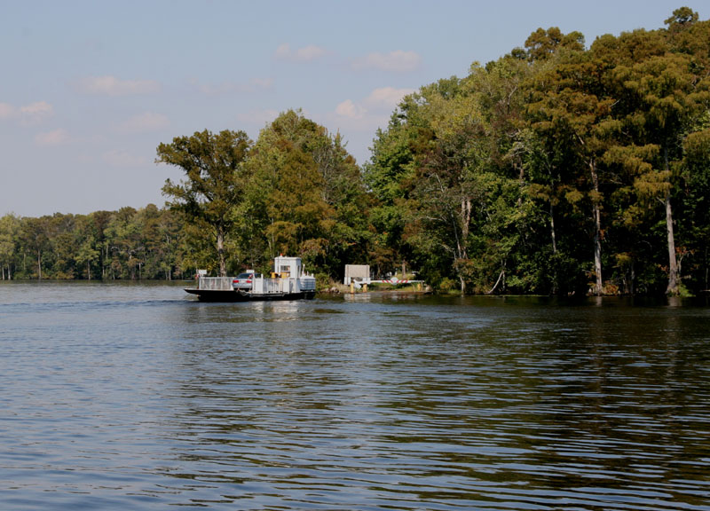 We had to stop and talk to locals here and there as we wound our way around the little country roads to get more directions. Finally, still following the guidance of locals, we went down what looked like a an unlikely road to a ferry as it was nothing more than a muddy old driveway, heading into what looked like a marsh with over grown bushes hanging over it, but, by golly, we found it. We arrived at the ferry landing. It was nothing more than a mud ramp that went down into the muddy creek. There was a rustic posted sign that said “Blow your horn for the ferry”. We could see the ferry on the other side across the creek. We felt a little presumptuous but honked the horn and out of nearby house comes the ferry captain. He gets on the ferry and into his little pilot house. Pretty soon we hear a couple back fires from the muffler that is projecting from the top of his “pilot house” which also spits out a big puff of black smoke and then we hear the engine begin chugging as he warmed her up. Pretty soon he started making his way across the creek being pulled by the old cable that was just barely visible as it surfaced from the murky muddy water. He pulled the ferry up to the mud bank where we watched and waited and then motioned me to drive on. Larry said it was fine and to go ahead. Once we were on, there was no hello or any chit chat from this guy. He immediately reversed direction and the little ferry loudly chugged its way back to the other side. Once we got there, the old guy put the ramp down and said “wher’r ya all frum?” We said San Juan Island, Washington. His eye brows lifted as I’m not sure if he knew exactly where that was but then all he said was “We nev’r hed eeny un frum outta state!”