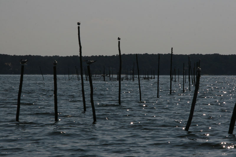 I'll never understand how they managed but they were all very friendly, polite and seemed happy as clams. There was another family living on big sailboat on the opposite dock that had been cruising the world, did a stop here and haven't left for 9 months. They too had a family of kids and the kids from both families would all get together to play, swim and swing by a rope off one of the masts into the dark river off the boat. These kids were having a ball living here on the river. NON STOP WAKES We also had a great view of all the boats heading out the river in the early morning hours and well all hours of the day. Some were cruising boats heading south and others were sports fishers and then there were a lot of hunters. Yes, hunters, there were a gazillion hunters racing by in their flat open skiffs, disguised in camouflage with huge monster engines hanging out the back. They think nothing of racing by spreading big rooster sprays and waking the crap out of who ever is at the docks. I'm sure they must not realize what they are doing at such a long distance away but it was non stop rock and roll on our boat and it became impossible for Larry to get any rest and actually Zig and I were having a hard time with it too. It was like being out in rough seas. We were getting so sick of it that we'd get in the car to take a drive just to get some peace. Elizabeth City though was a great stop and regardless of the wakes we had a good stay there and are grateful this was where we stopped to get Larry better. MINE FIELD Though the front is coming the seas were very calm, in fact most of the day the water was like glass. We meandered our way through mile after mile of endless crab pots put there by a new influx of Vietnamese that have moved to the area. We were told by the ex Coast Guard Captain at the Rosebuds Welcome Party that they have no sense of leaving a path open for boaters nor can you call them on the radio as they are chattering away in their native language and don't speak a word of English. It was exhausting watching out for them and weaving left and right making the trip double the length. Good thing the water was like glass because if it was choppy they would be difficult to see and this would be a mine field. THE GREAT ALBEMARLE No one else was out on this grey white day on the water today. We'd pass home after home nestled in the trees along the water front and a few farms too, and finally left the Pasquotank River and headed into the great Albemarle Sound. It was strange as we crossed the imaginary line of the Intracoastal again only visible by the markers and magenta line across the chart. It's the path that others take coming out from Coinjock but they instead head across Albemarle up the Sound towards more protected waters of Alligator River. We finally lost all sight of land as everything that resembled a tree or building disappeared along the surface. It was like being out in the ocean again without the swells.