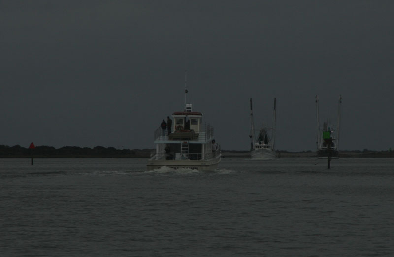 GETTING OUT OF THE STORM Up ahead I see two big fishing boats heading this way with their paraffin's up and running lights still on as it still is pretty dark out. They look big and ominous as they come our way. We will have to pass them in this shallow narrow channel. It’s exciting but nerve wracking. They must have just come in through Oregon Inlet from the Atlantic. It’s supposed to be very rough out there today; maybe they are coming in to get a break from the storm. Imagine being a fisherman in these waters, fishing daily over ancient ship wrecks taken by the mighty and fierce waters off the Outer Banks. It makes me shiver to think of it. I take some pictures of these guys as they go by hoping to catch the how powerful they look. They are painted to look fierce like the jobs they do.