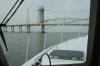OCEAN SWELLS FOR A CHANGE So of we went headed down the Chesapeake in search of a ham dinner. The seas were much calmer today and the skies crystal clear. We passed the Rappahannock River and began to feel the swells of the ocean from the mouth of the Chesapeake for the first time. They were small but weird as they mixed in with the Bay and made for a washing machine type ride but on the slow gentle cycle. COMMERCIAL TRAFFIC We began to see freighters anchored along the way and heard lots of commercial traffic on the radio. We were monitoring Channel 13 for a heads up on what and where they were. As we passed New Point Comfort Light the swells evened out and it was a gentler up and down ride over the ocean swells. Soon we were running alongside the shipping lanes with lots of markers to look at and identify. We passed Hampton Roads and then made a starboard turn officially heading up James River. JAMES RIVER Monstrous Naval ships lined the docks, getting repairs and modifications done, some draped under big tents with sounds of drilling and hammering echoing across the water. Workers the size of ants were moving about on the decks and the scaffolding structures that laced up the multi story sides of these monster ships and small craft like our Protector boat patrolled the waterways looking for suspicious boats. It was the fast red and gray Coast Guard boat with its big outboard motors racing around flashing lights and acting cocky like a feisty young stallion. They’ve got a lot to protect around here and have to be on their toes. HAMPTON ROADS BRIDGE TUNNEL We went past the Hampton Roads Bridge Tunnel which is the weirdest sight. You see a road coming partially across the water filled with cars and trucks doing their work hour commute when suddenly they disappear as they drive into a big yellow building. That’s because on both sides the traffic is diverted down under the river into a tunnel and come up the other side mid way across the river. A JET SKIER FROLICKING IN OUR WAKE Ahead we see the big James River Bridge. Under we go and now it’s time to start looking for the markers to the Pagan River that will take us up river a few miles to Smithville. We’re making our way nicely when I see some guy on a big powerful jet ski racing from shore to our boat, well not the boat exactly, but to our big wake. We’ve discovered that this boat puts out a pretty impressive wake and I guess this guy just couldn’t resist having some fun with it. Zig and I watched him for about ten minutes as he criss crossed up and over the wakes behind us, flying high into to air at times. It was incredible! Finally we slowed down as we began to enter the markers for the channel to the shallow waters of the Pagan River and he came up beside us and gave us a big thumb up! I guess he was thanking us for the awesome time he just had. PAGAN RIVER I’ve got to say this ride up the Pagan River was worth the detour as this area is absolutely beautiful. The river gently meanders through marshlands and the river banks are dotted with picturesque houses and old oyster docks and warehouses and in the mix is abundant wildlife viewing. We saw white egrets, variety of unusual ducks, osprey, grey heron, etc. It is absolutely a beautiful trip.